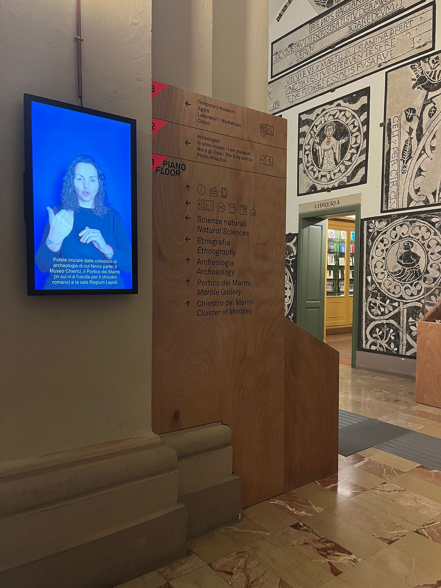 In particolare, all’ingresso principale è stato apposto un nuovo totem che accoglie la segnaletica informativa a caratteri ben visibili e che comprende anche una prima mappa tattile e un video in LIS che descrive gli spazi visitabili del museo.Oltre a quella dell’ingresso principale, anche sugli altri due piani di Palazzo dei Musei è stata posizionata una mappa tattile per ipovedenti, al fine di orientarsi con QR code e grazie alla descrizione audio del percorso.
