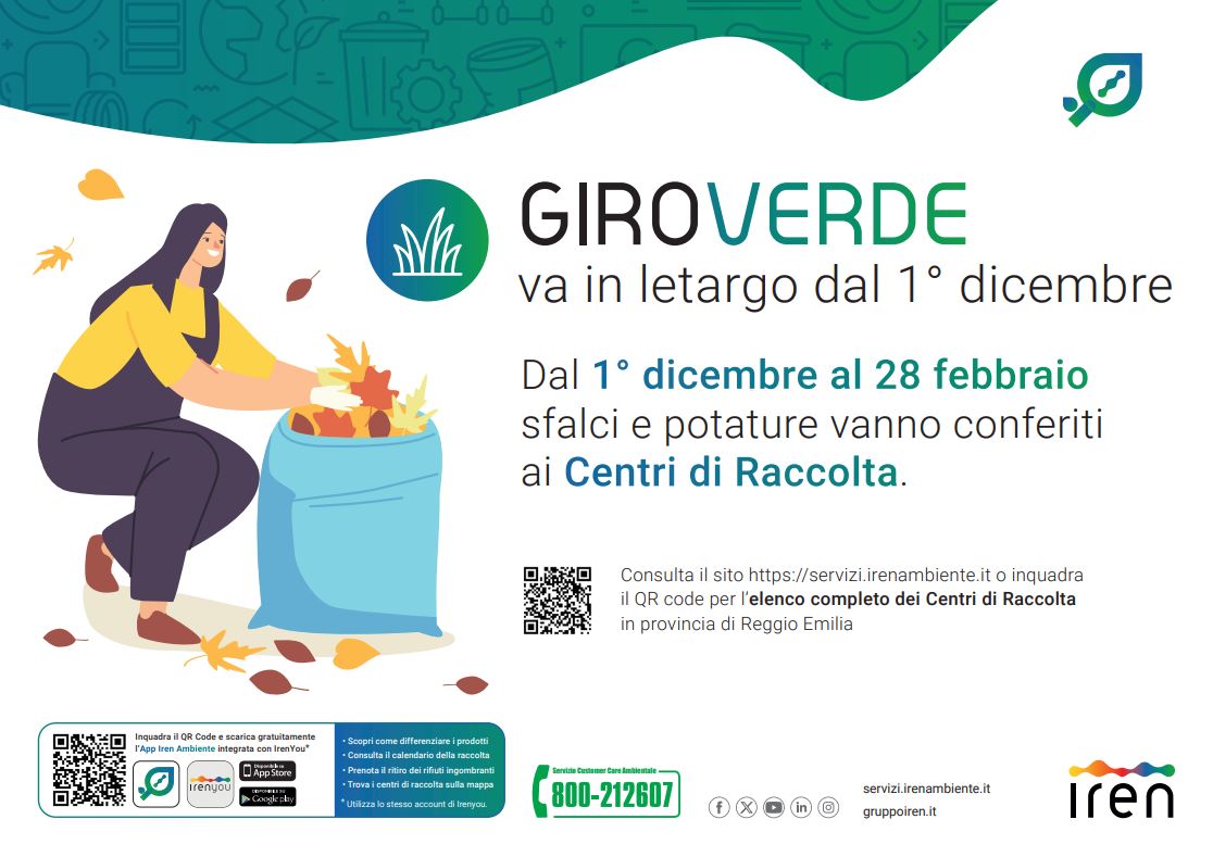 Dal 9 al 14 dicembre raccolta aggiuntiva straordinaria di potature e sfalci d'erba sul territorio comunale di Reggio Emilia prima della consueta sospensione invernale del Giroverde programmata dal 1° dicembre al 28 febbraio.