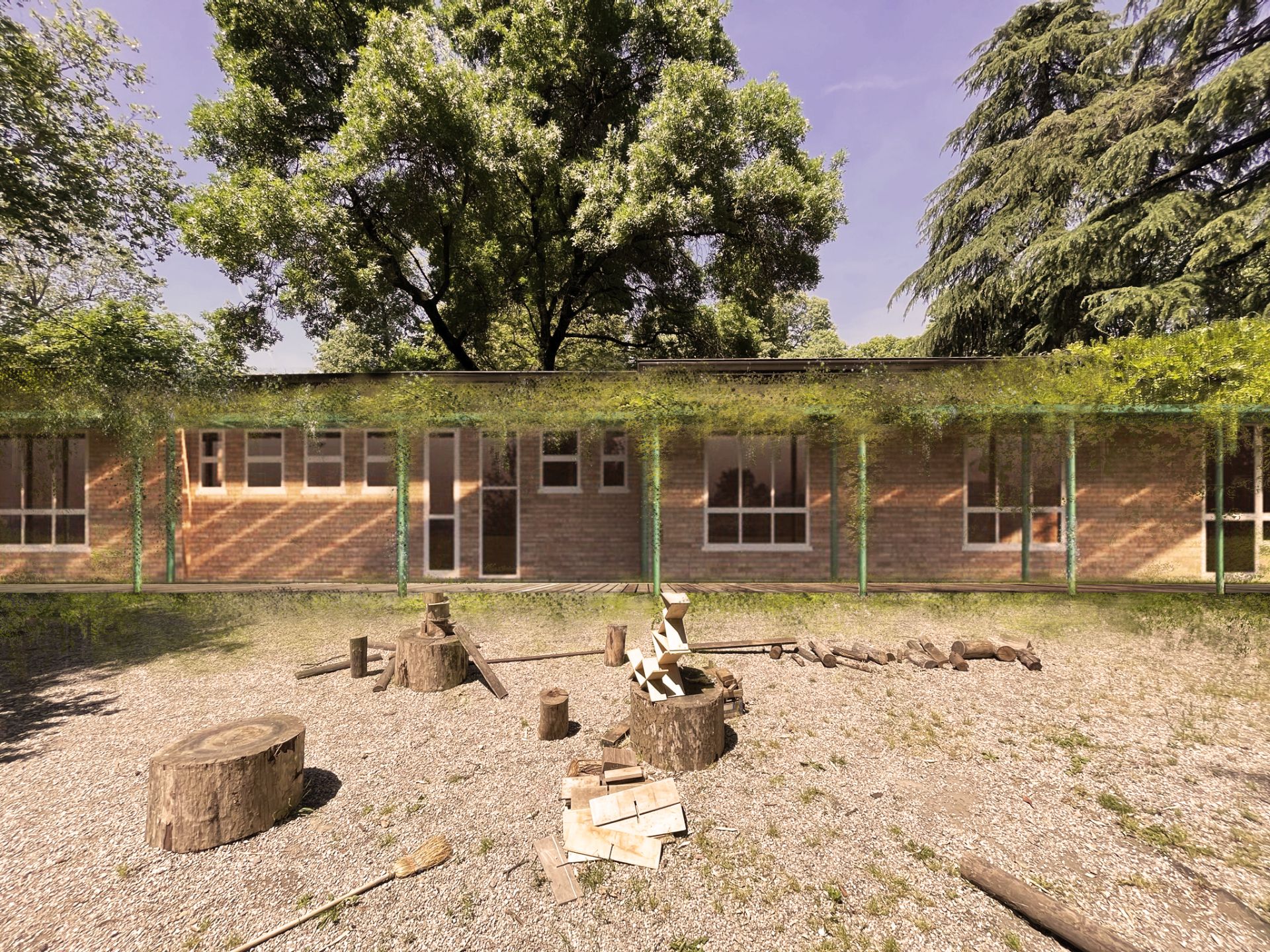 Verrà infine sostituita la recinzione esistente con una nuova soluzione che, garantendo la sicurezza dei bambini, punta a favorire una relazione più aperta e permeabile tra gli spazi scolastici e il contesto naturale circostante, creando una continuità visiva che inviti alla scoperta e al contatto con la natura. L’intento è quello di portare l’ambiente naturale del parco all’interno dell’area scolastica, rendendo l’esterno più accessibile e parte integrante dell’esperienza educativa. In questo modo, si favorisce un’interazione continua tra i bambini e lo spazio verde, stimolando la loro curiosità e sensibilità verso la natura, mentre la scuola diventa un luogo in cui i confini tra interno ed esterno si dissolvono, favorendo l’apprendimento attraverso l'esplorazione diretta dell’ambiente circostante.
