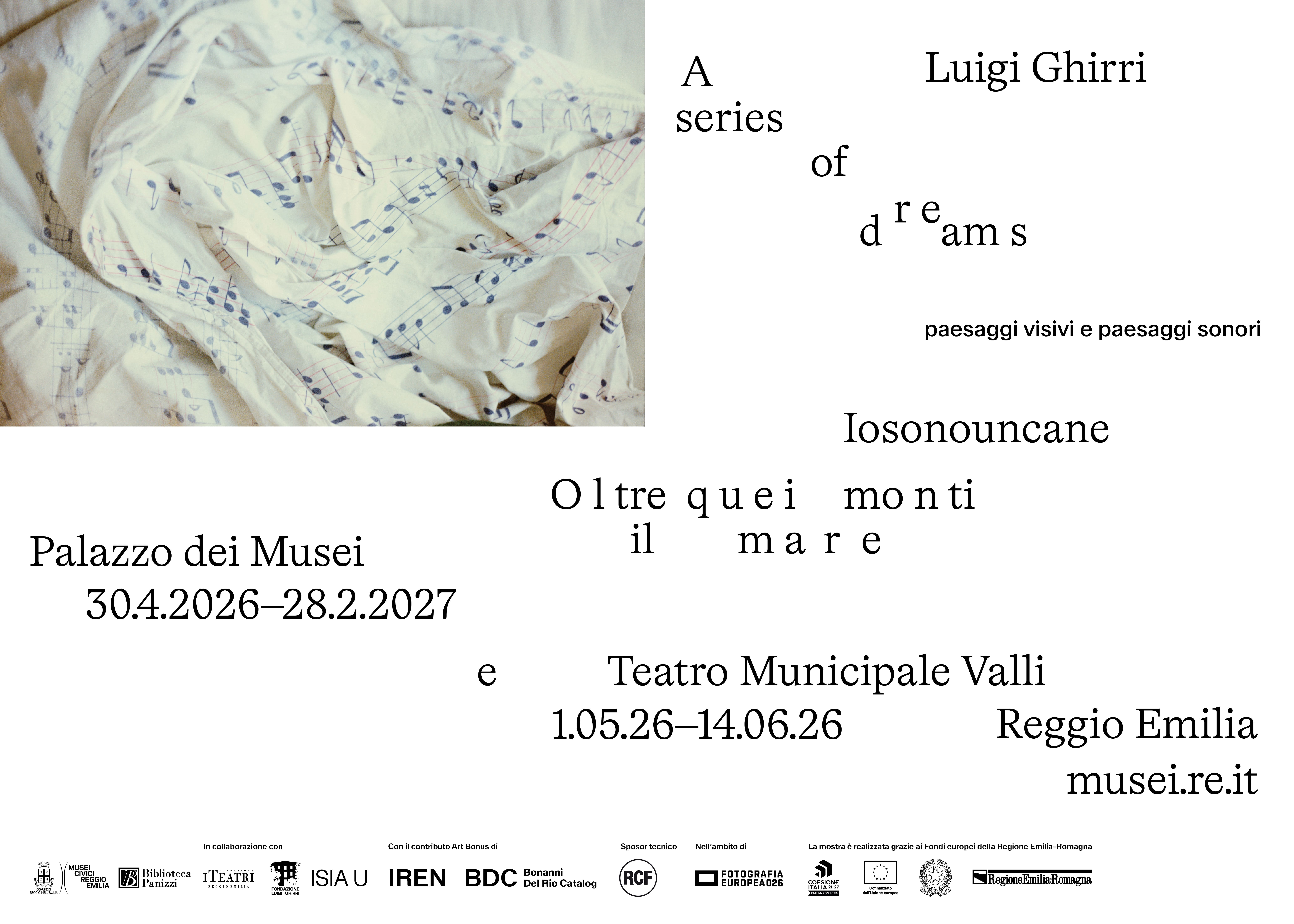 La mostra “Luigi Ghirri. A Series of Dreams. Paesaggi visivi e paesaggi sonori”, allestita ai Musei Civici di Reggio Emilia dal 30 aprile 2026 al 28 febbraio 2027 nell’ambito di Fotografia Europea, esplora il profondo legame tra fotografia e musica nell’opera di Luigi Ghirri. Il progetto include anche una sezione speciale (“Oltre quei monti il mare”) con il contributo del musicista Iosonouncane e un focus al Teatro Municipale Valli dedicato alle copertine musicali.