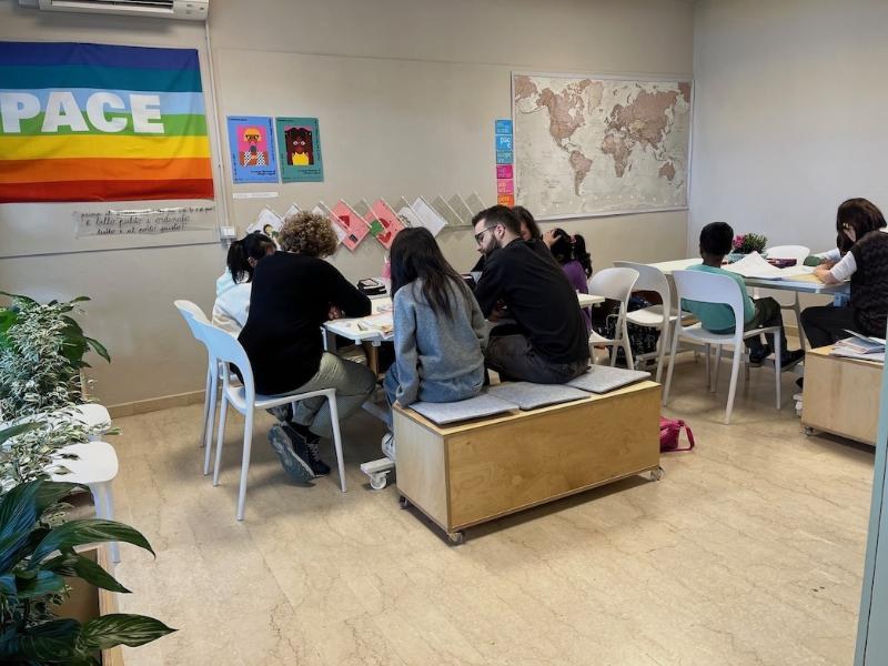 La riqualificazione è completata da arredi flessibili e mobili, come tavoli leggeri con piano ribaltabile e panche su ruote utilizzabili anche all’esterno, che fungono sia da sedute sia da contenitori per zaini e materiali. Questa configurazione favorisce un uso dinamico dello spazio, l’autonomia dei ragazzi e un ambiente più ordinato e funzionale per le attività educative.