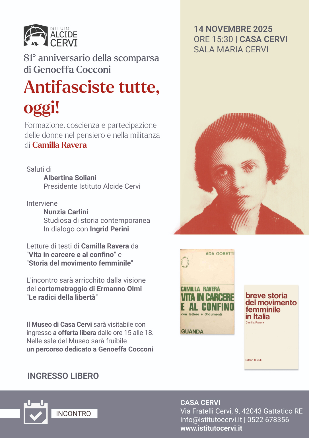 Incontro pubblico dedicato alle donne dell’antifascismo e al pensiero di Camilla Ravera, tra le più importanti protagoniste del Novecento italiano, in occasione dell’81° anniversario della scomparsa di Genoeffa Cocconi, moglie di Alcide Cervi e madre dei Sette Fratelli e delle sorelle Rina e Diomira.